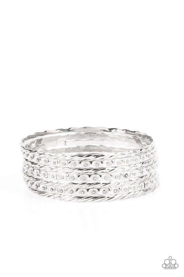 Embossed in slanted ribbons of textured and studded hammered patterns, trios of mismatched silver bangles stack across the wrist for an intense industrial vibe.
