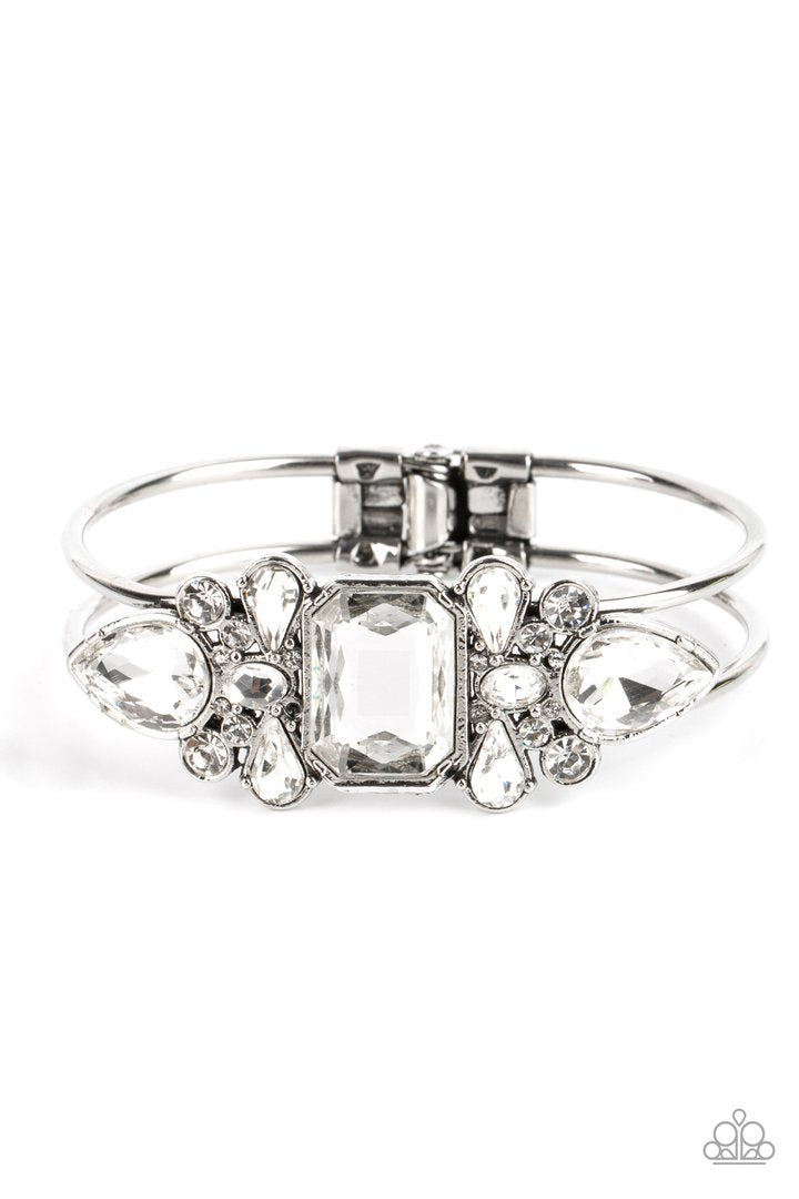 A blinding collection of round and marquise-cut white rhinestones are encrusted across the front of a shiny silver bar, curling around the wrist to create a timeless cuff-like bangle. Features a hinged closure.