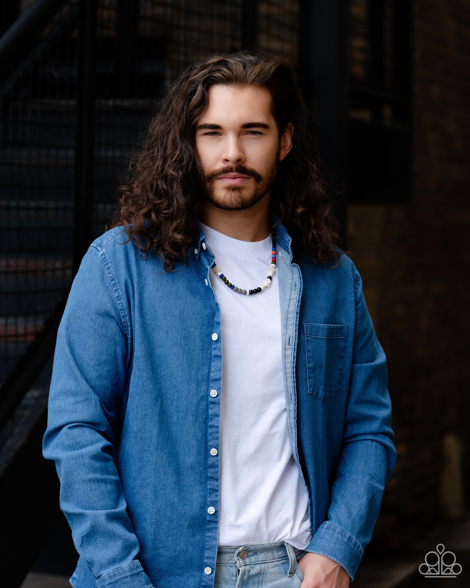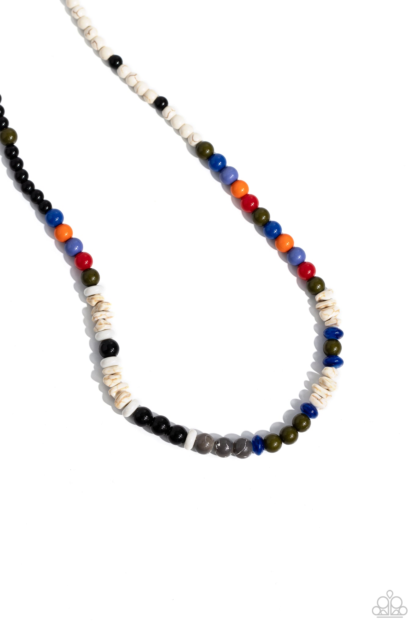 Colorful sections of multicolored beads and gray crackle bead accents adorn a strand of chiseled and round white marbled stones and stone beads, creating an earthy compliment below the collar. Features an adjustable clasp closure. As the stone elements in this piece are natural, some color variation is normal.